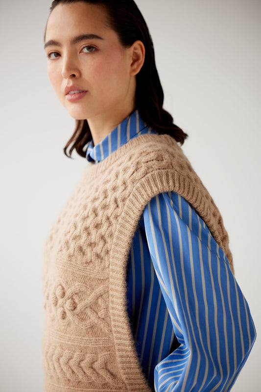 Christine Alcalay’s functional and flattering knitwear collection is crafted from natural fibers like merino and baby alpaca wool, offering luxurious comfort and sustainability. These materials are chosen for their softness, durability, and lower environmental impact than synthetic alternatives.