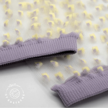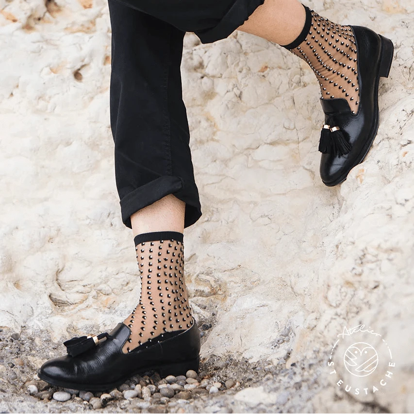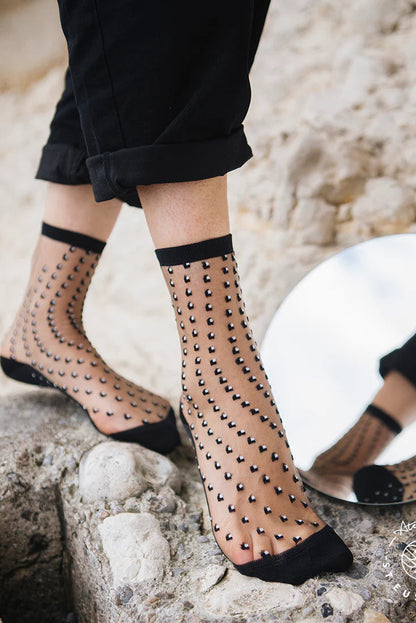 This sophisticated and refined design draws inspiration from the solar panels that follow the sun's movement in the heart of Nevada. Featuring a black and white or yellow polka dot pattern, these sheer socks gracefully embrace your ankles.
