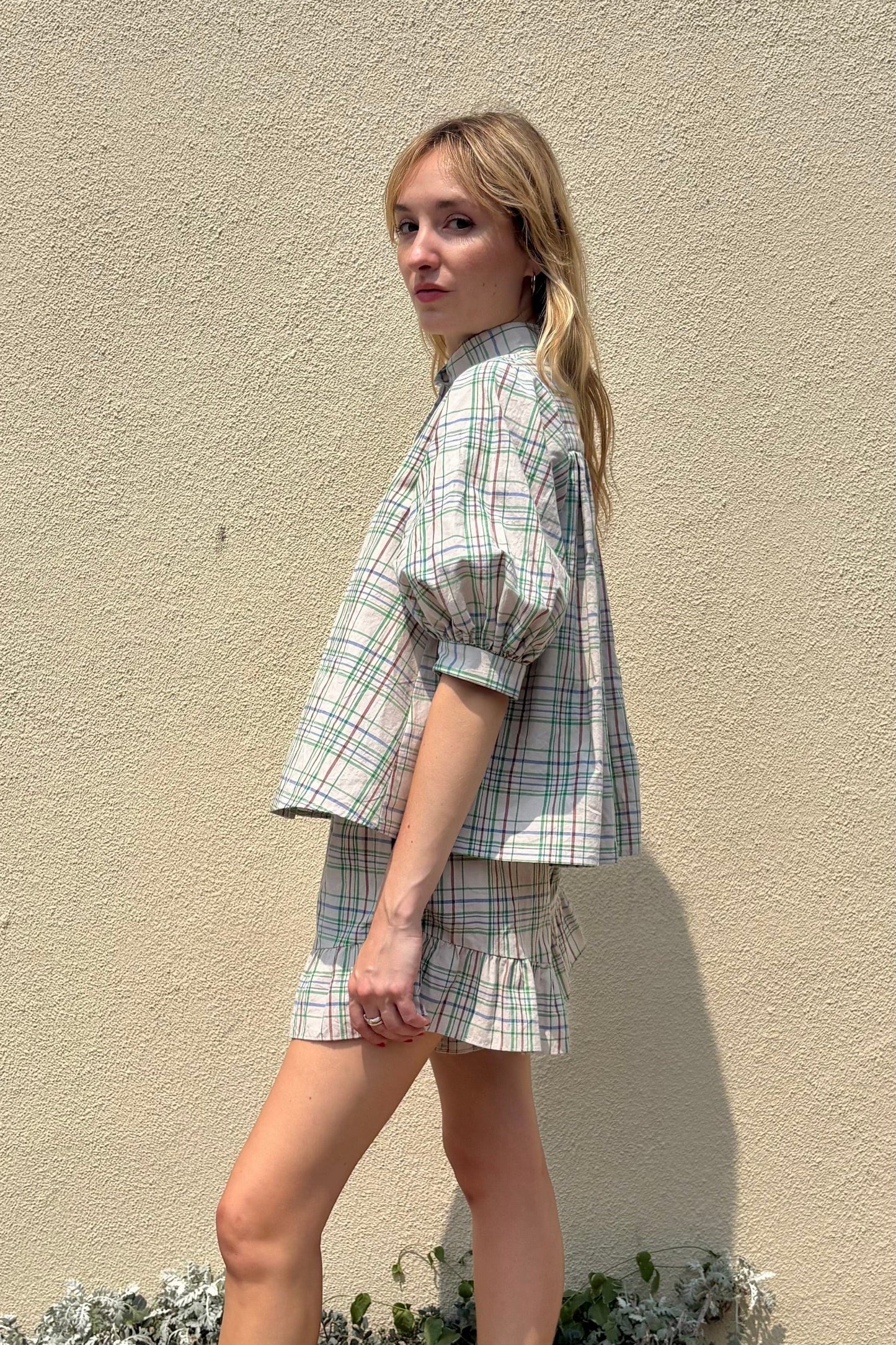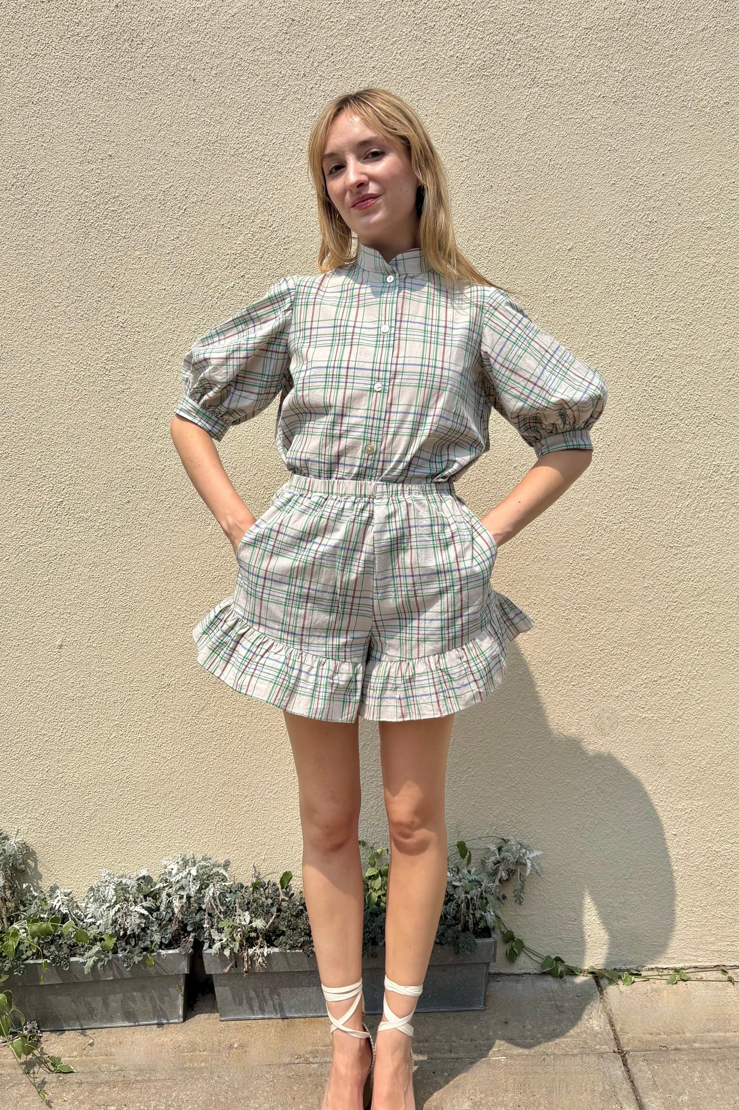 These sweet linen & cotton shorts with elastic at the waist are fun, feminine and extremely wearable. The Una features a high rise waist and a flattering stand away hem with a ruffle at the end. Throw on your favorite tank and call it a day!